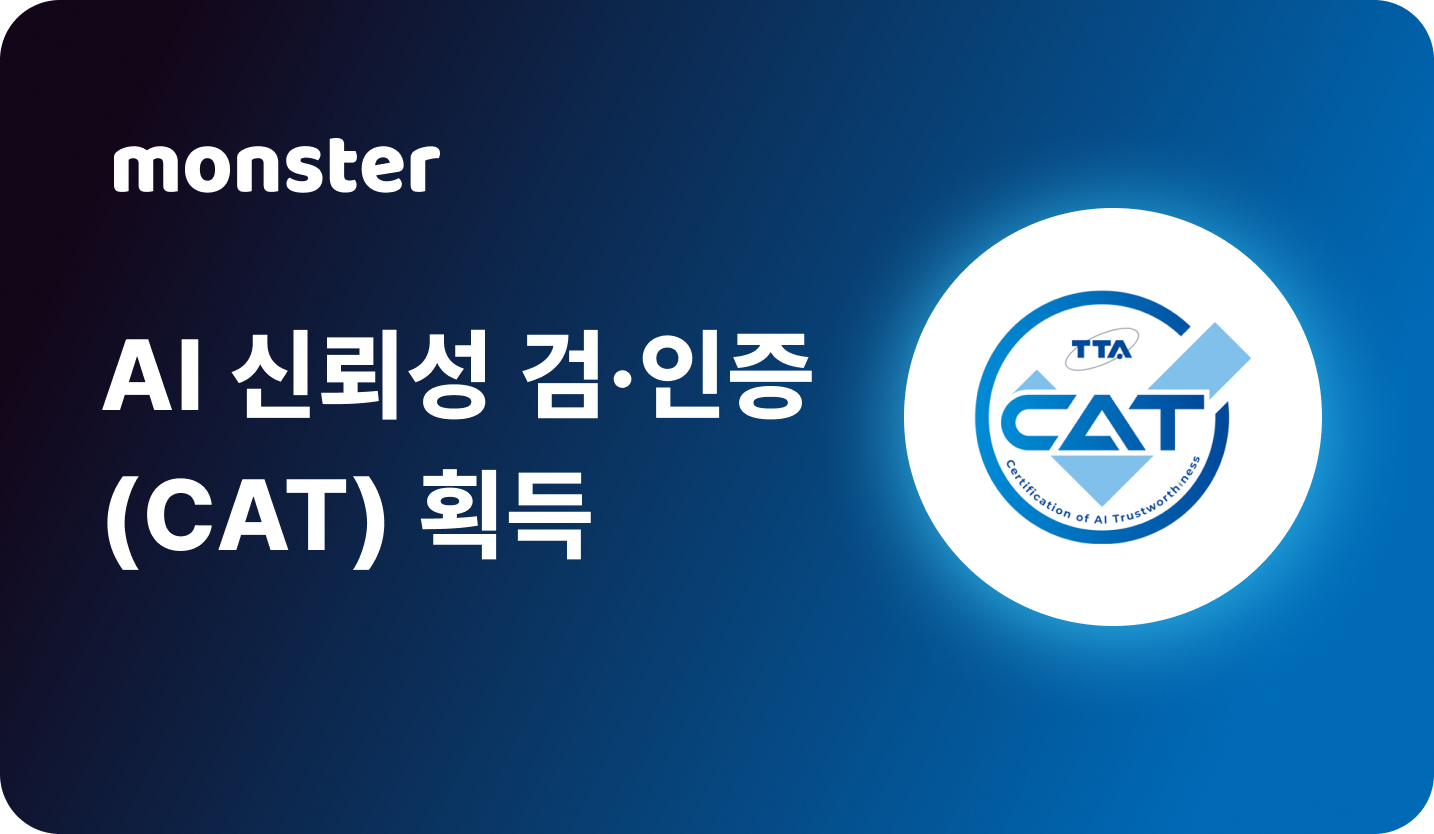AI 채용 솔루션 몬스터가 과학기술정보통신부와 TTA가 주관하는 AI 신뢰성 검·인증(CAT) 을 획득했습니다. 이번 인증은 공정성, 안전성, 설명 가능성 등 6가지 항목에 대한 까다로운 심사를 통과한 결과로, 채용 평가의 객관성과 신뢰성을 공식적으로 인정받았다는 의미를 갖는데요. 몬스터는 앞으로도 공정하고 투명한 AI 채용 환경을 만들어가는 데 앞장서겠습니다.