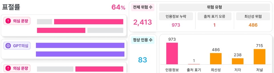 검사 결과는 AI 의심도에 따라 안전·주의·위험의 3단계로 제공되고, 단락별 AI 의심도와 생성형 AI가 썼을 가능성이 높은 문장의 순위가 함께 제시된다.