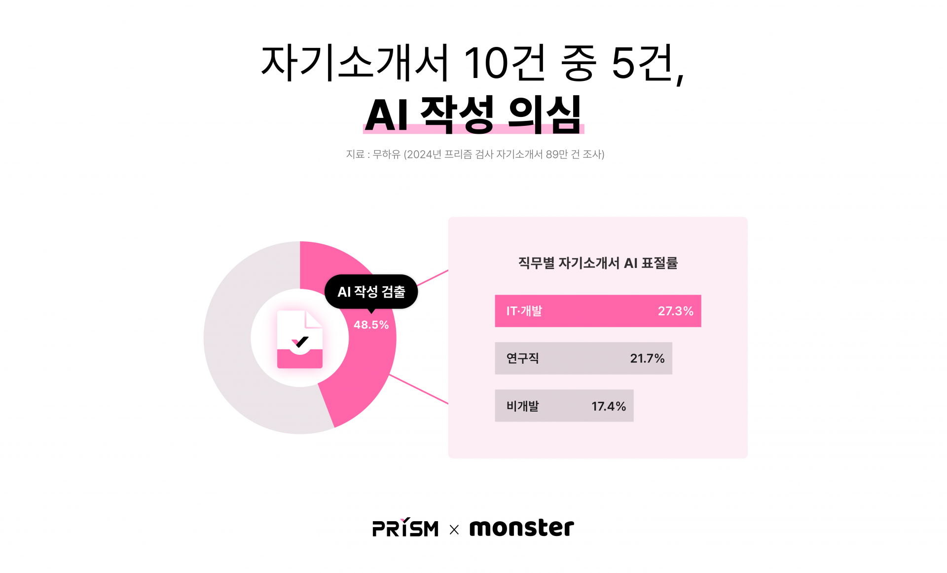 AI 기업 무하유는 25일 자사 서류평가 설루션 '프리즘'에서 'GPT킬러' 기능을 활용해 분석한 결과, 지난해 금융권, 공기업 및 일반기업 등에 제출된 89만건의 자기소개서 가운데 48.5%가 생성형 AI를 활용한 것으로 의심됐다고 밝혔다.